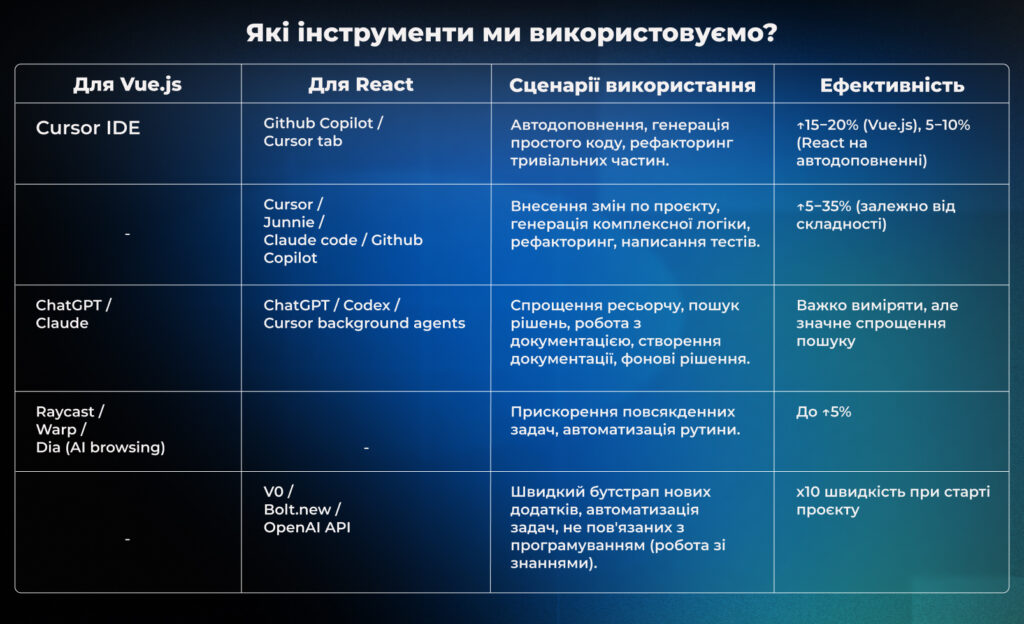 Тут ми розповімо про наші внутрішні процеси та ШІ-інструменти для розробників, які ми успішно застосовємо у Front-End розробці на Vue.js та React.